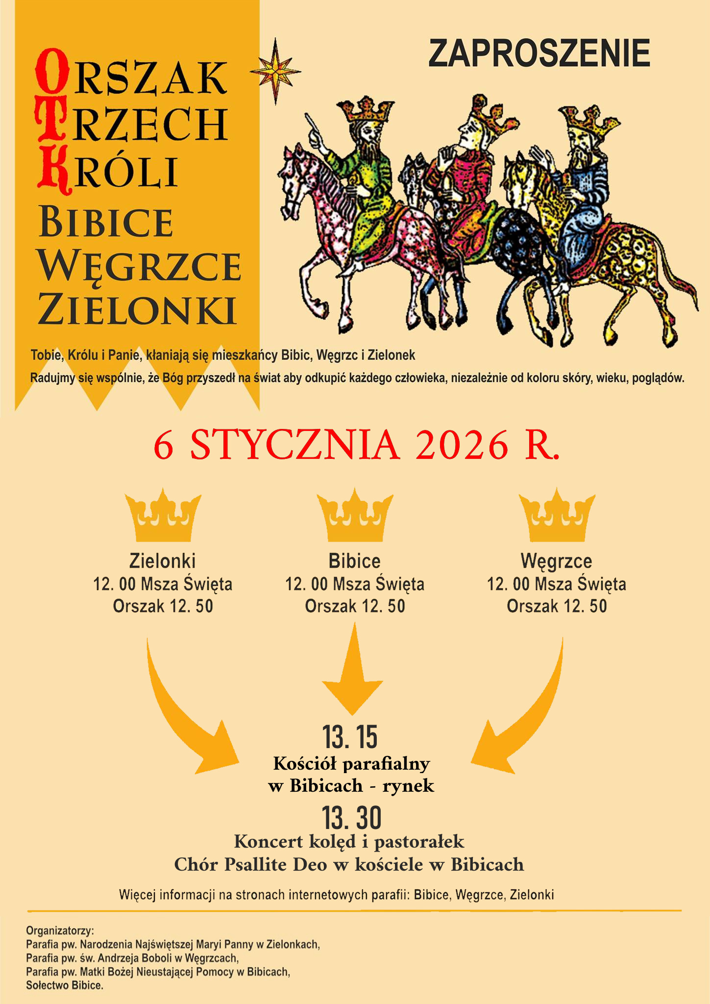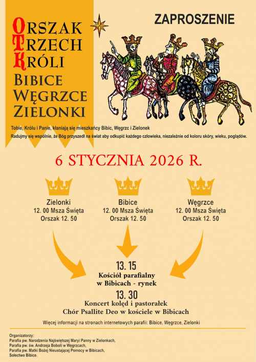 1. Po mszach w kościołach w Zielonkach, Bibicach i Węgrzcach o godz. 12.00 uczestnicy otrzymają tradycyjnie korony i śpiewniki, aby każdy mógł aktywnie włączyć się w Orszak – następnie każdy z orszaków ruszy w stronę kościoła pw. Matki Boskiej Nieustającej Pomocy w Bibicach.